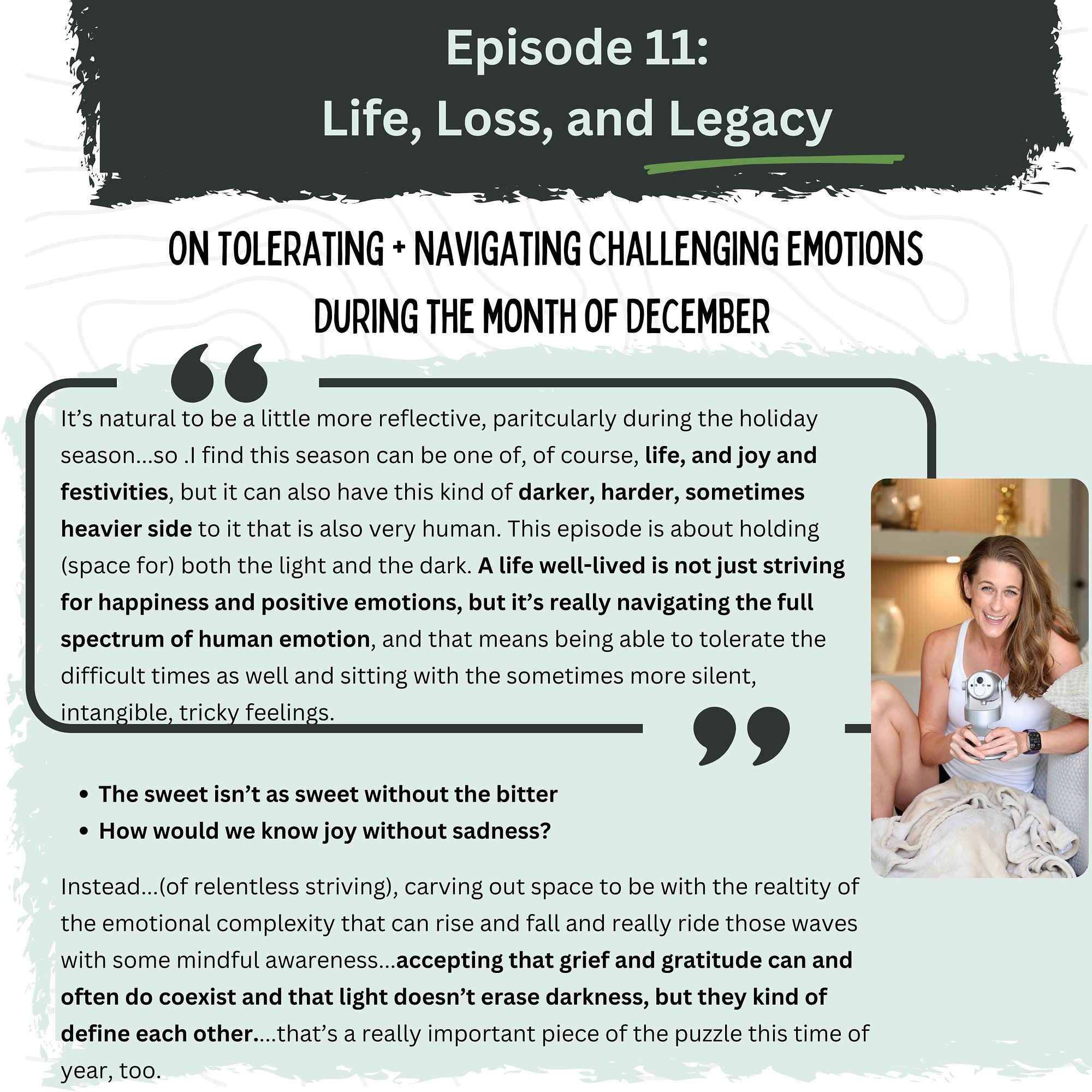 This episode explores how we can create and hold space for both the light, sparkly festive fun of the holiday season and allow the sometimes heavier, more vulnerable, tricky times and feelings, too. After all, emotional health does not mean striving relentlessly for happiness or positive emotions; but rather, allowing grief and gratitude to coexist, and learning to navigate the full spectrum of emotion that comes with being human, while cultivating a life well-lived and crafting a legacy we are proud to leave behind.