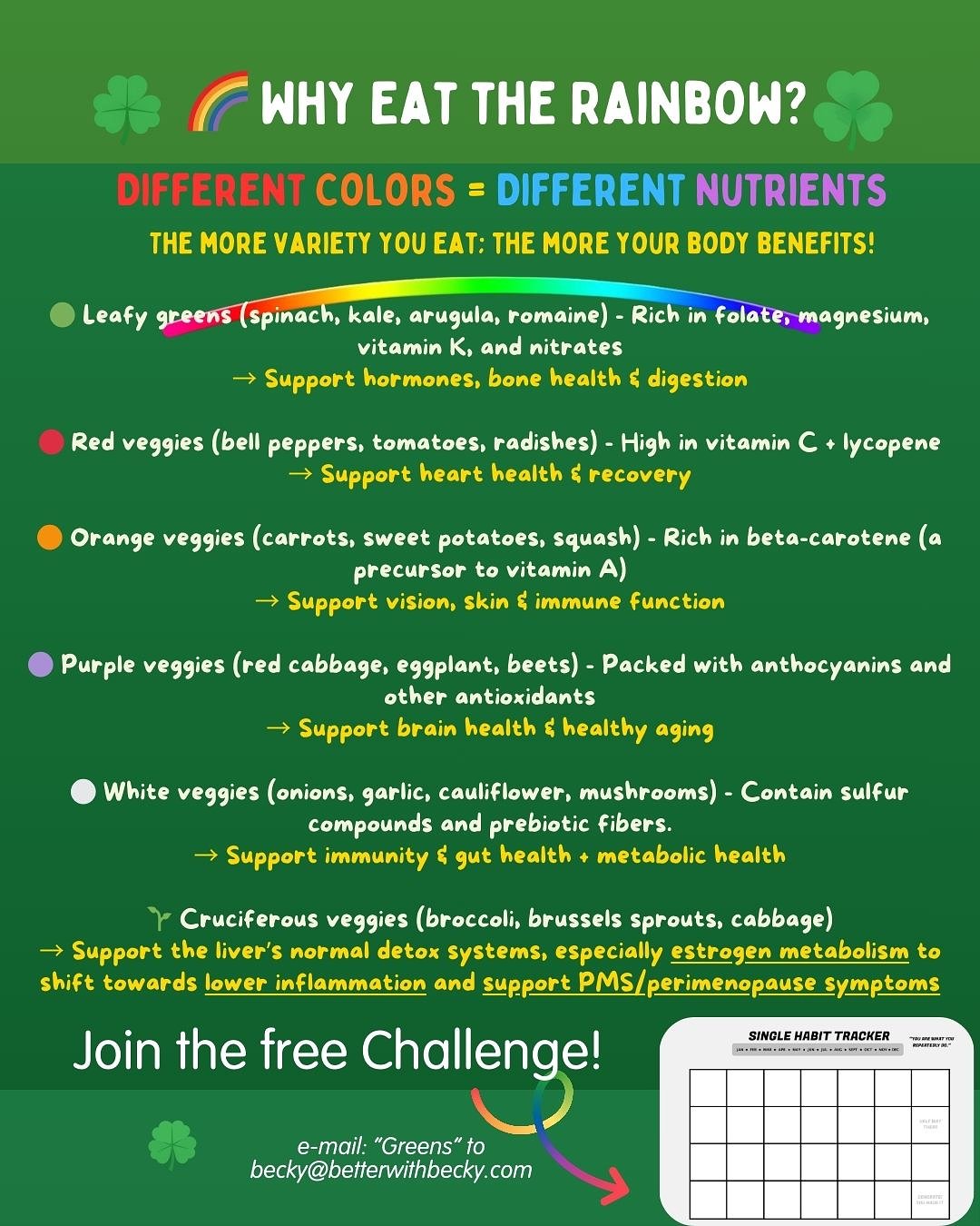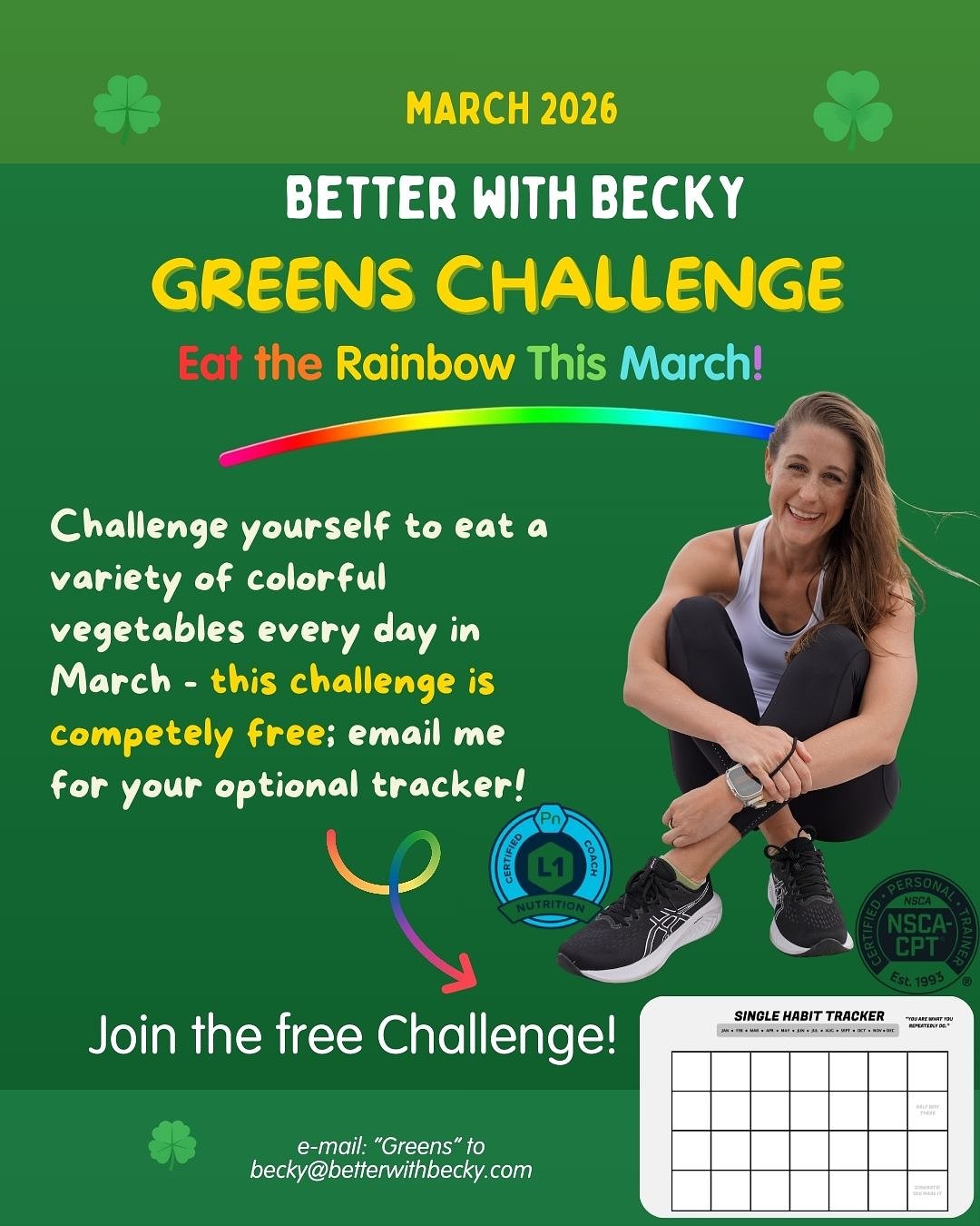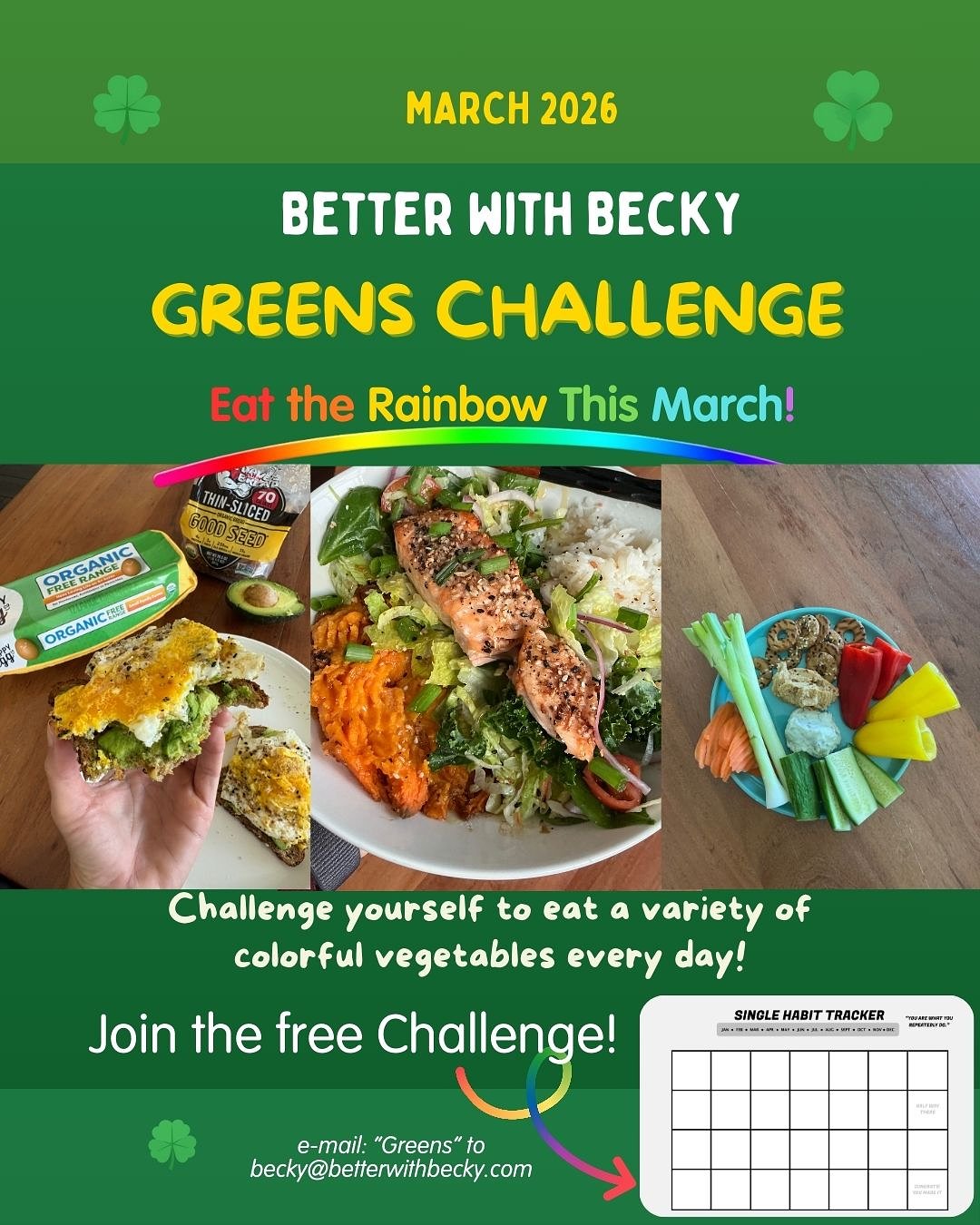 Feel free to join me! The Better with Becky Greens Challenge is back and if you'd like an optional tracker to mark your progress day to day, you can email me "greens" at becky@betterwithbecky.com
